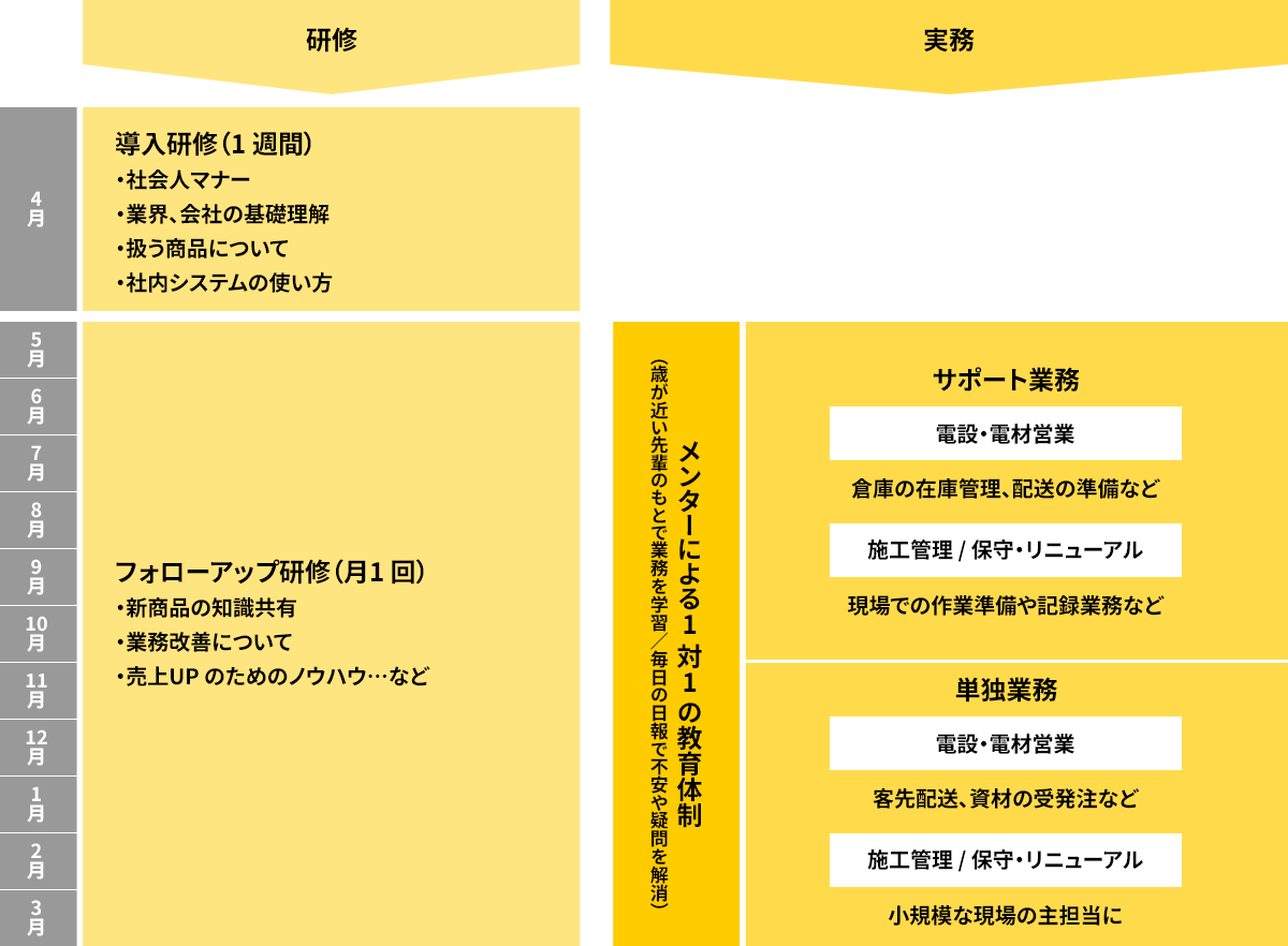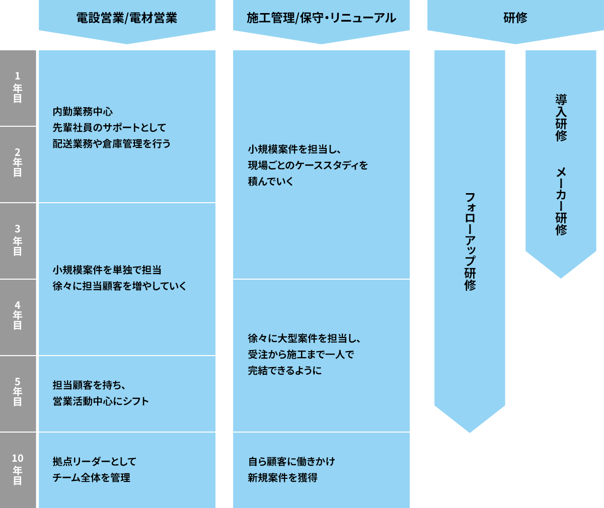 営業職であれば最初は内勤業務が中心で、倉庫作業や先輩との配送同行を経て、徐々に単独で配送を任せていきます。施工管理や保守・改装であれば、先輩が担当する現場のサポートとして資材の準備を中心に行い、徐々に小さな現場の主担当として独り立ちしていきます。いきなり一人で任せることはないのでご安心ください。